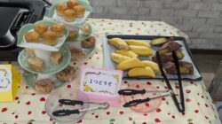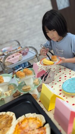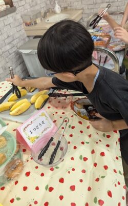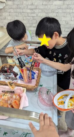 嬉しそうに好きなおやつをトングでお皿に取り分けて