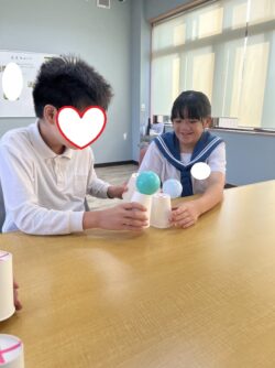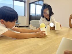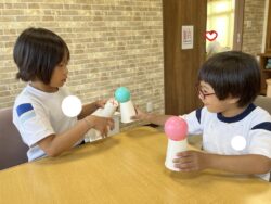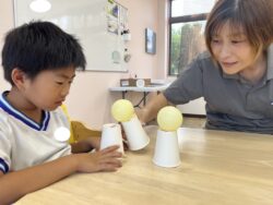 ①紙コップを逆さにして、底部分にボールを置きます。それを落とさないように、隣の人のコップに移していくとものと、②風船バレーを行いました。①ではコミュニケーション、集中力、力加減など。②では、空間認識、集中力、目と手の協応などを目的にしました。