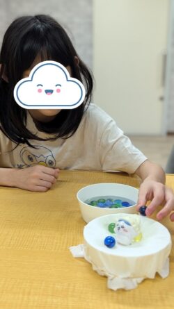 ピンッと張ったティッシュの上に濡れたビー玉やおはじきを順番に乗せていく【ドロップゲーム】