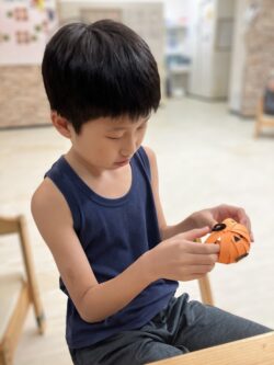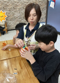 ハロウィンも近いということで、みんなでカボチャの飾りを作りました!