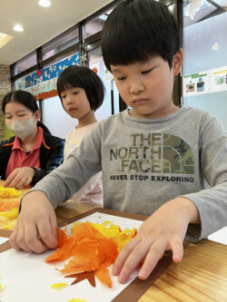 落ち葉や秋の木をオレンジ色と黄色のおはながみをちぎって貼り付け、