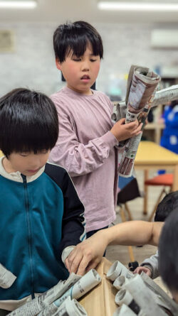 木の棒に見立てて新聞紙を丸めて棒状にし、屋根の部分と壁の部分を分担して製作し、組み合わせて家の形にしました。