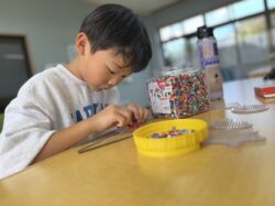 午前中は、レジンをしたり、ビーズ、トランポリン、カードゲーム、野菜採取をみんなそれぞれ自由に過ごしました🎶