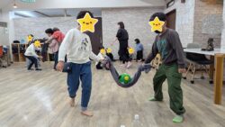 一人ではなく“二人で一つのボールを転がす”という活動で、声をかけ合いながらタイミングを合わせることがポイントです✨