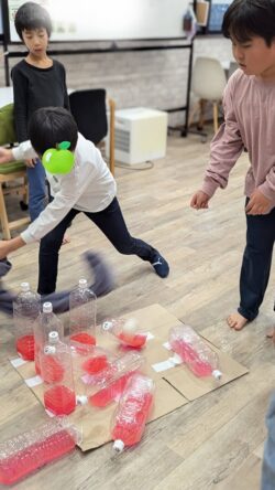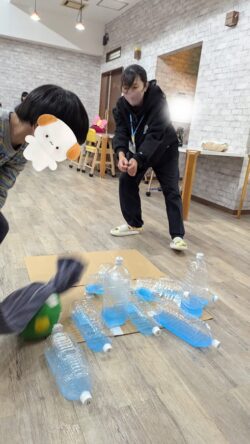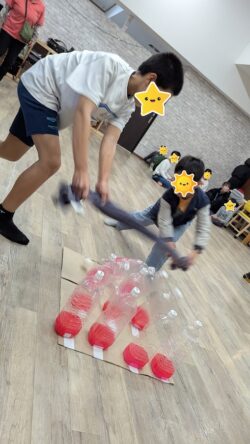 倒れたピンを見て嬉しくてジャンプしたり、悔しくてもう一回挑戦したりと、子どもたちの笑顔と声がたくさん響く時間になりました😃