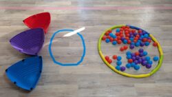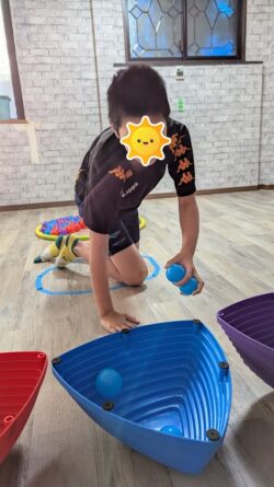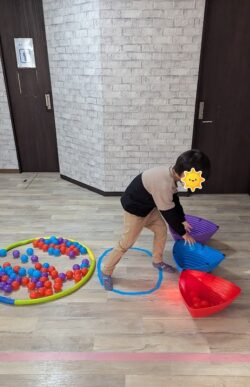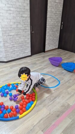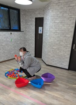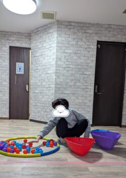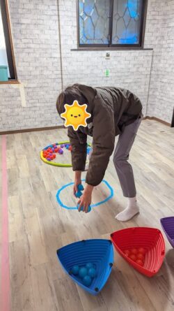 ランダムに置かれたカラーボールを同じ色の箱へ仕分けることで、色の識別や位置の把握などの視覚認知力を高めていく。