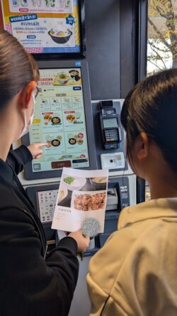 事前にメニューを決めて見通しをもって行動することや、券売機の操作を通して金銭の扱いや注文の流れを理解すること。
