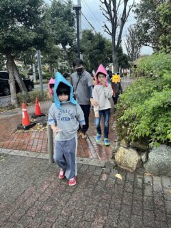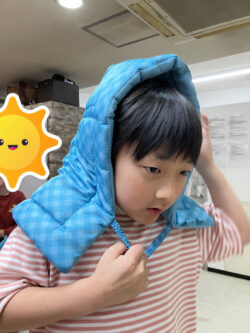 防災頭巾をかぶり、近くにあるさいたま市保健所駐車場前の並木道まで避難します!