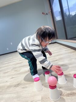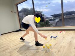 前半は、3色のカラーボールを少し離れた所にある同じ色の紙コップに