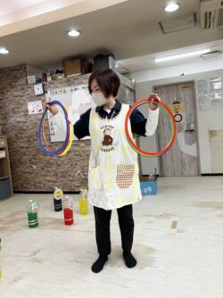 手と目の協調、集中力を目的として【輪投げ】を行いました。