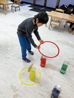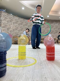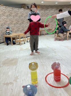 色水の入ったペットボトルに同じ色の輪を投げていきます✨