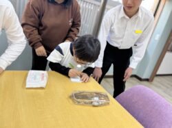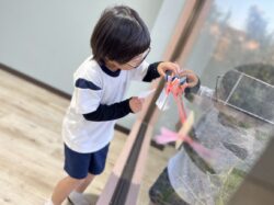 しりとりの単語を書きます✏️ 次に、走って紐にぶら下がってる洗濯ばさみに紙を挟みます。