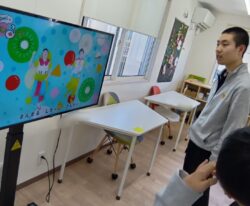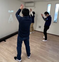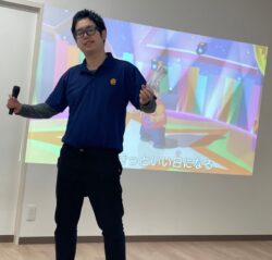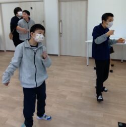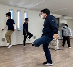 午前は身体を動かして楽しみます。皆さんで合わせて。
