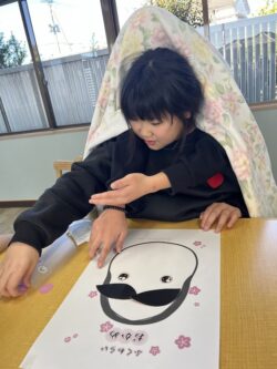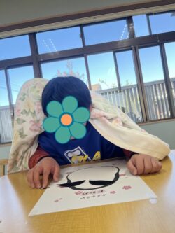 二人羽織福笑いでは、2人1組になって、後ろの人は毛布をかぶり見えない状態で前の人の指示に従い顔のパーツをおいていきます。