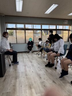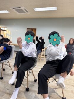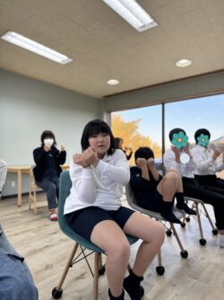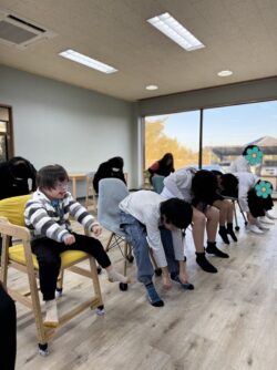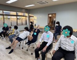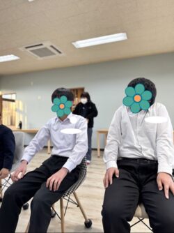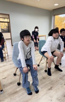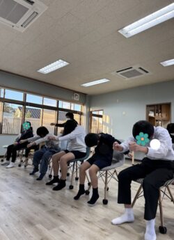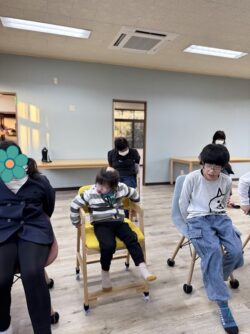 ⑨腕を後ろに回して椅子を掴み、体を前に倒して両足を前後に動かします。