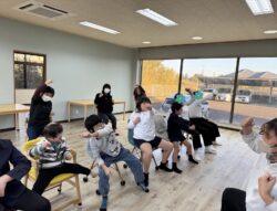 ②手を肩につけて肩甲骨を意識しながら肩を回します。