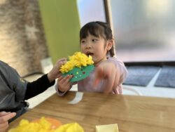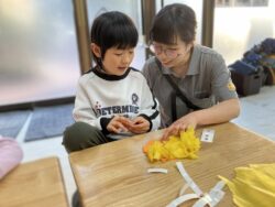 顔を貼ったら、花紙を丸めて鬼の髪の毛を作ります!🫧
