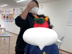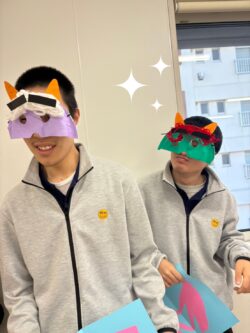 油性ペンやボンド、ノリ、折り紙等を使ってお面を仕上げました。