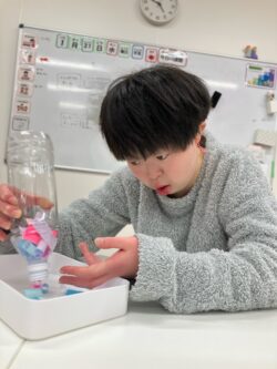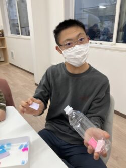 ペットボトルの中に入った細かくしたストローを取り出す2チームに分かれて15秒交代で対決を行いました💞