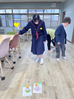 紐の輪に足を入れ1mくらい離れた紙に紙コップを置き、