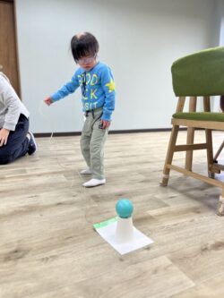 紙コップの裏にカラーボールを乗せて落とさずに歩きます⚾