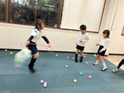2,中央で1人がスズランテープ🔴のついた袋を児童頭の高さでゆっくり回して、回っている↓のボールをみんなで集めるゲーム