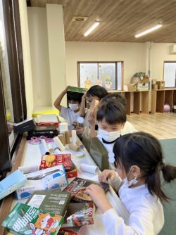 段ボールや、お菓子の箱、トイレットペーパーの芯などを自由に使い、好きな物を製作しました!