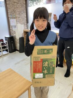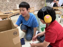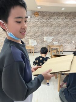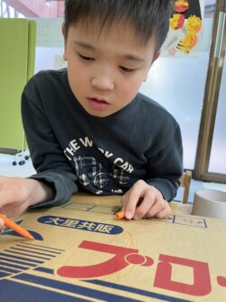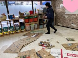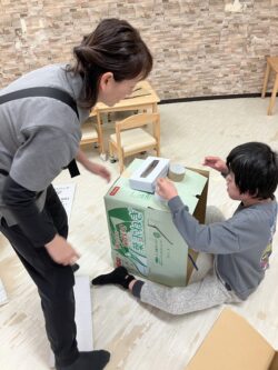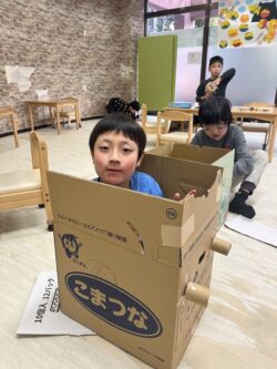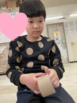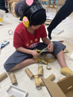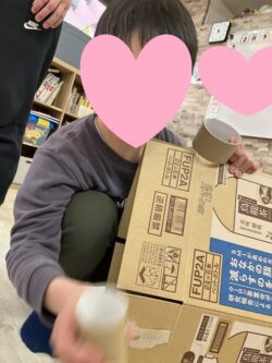 用意してある段ボールやガムテープの芯、トイレットペーパーの芯、お菓子の空箱を使って行いました!❤️
