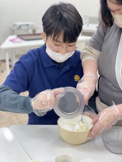 1分ほど置いてからハンドミキサーで混ぜて混ぜて、氷水を当ててさらにホイップ!