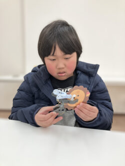 「ここが耳かな?」「ライオンはたくさんだね」と考えながら、指先をぎゅっと使ってがんばっていました💕