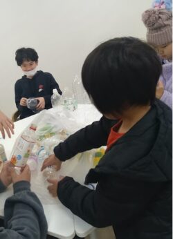ひとつのグループは「ペットボトルのラベルはがし作業」、もうひとつのグループは「ペットボトルをつぶす作業」です