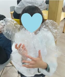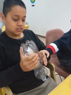 ペットボトルつぶしのグループは、力を入れてぎゅっと押し込みます💪