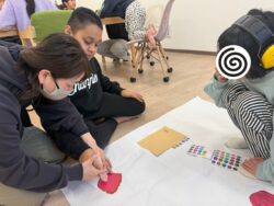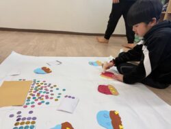 大きな模造紙に鬼の顔を貼っていきます。