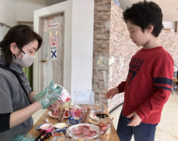 一人ずつ手作りテーブルに出てきて、スタッフと丁寧にカップに一段一段とパフェの層を作っていきます。