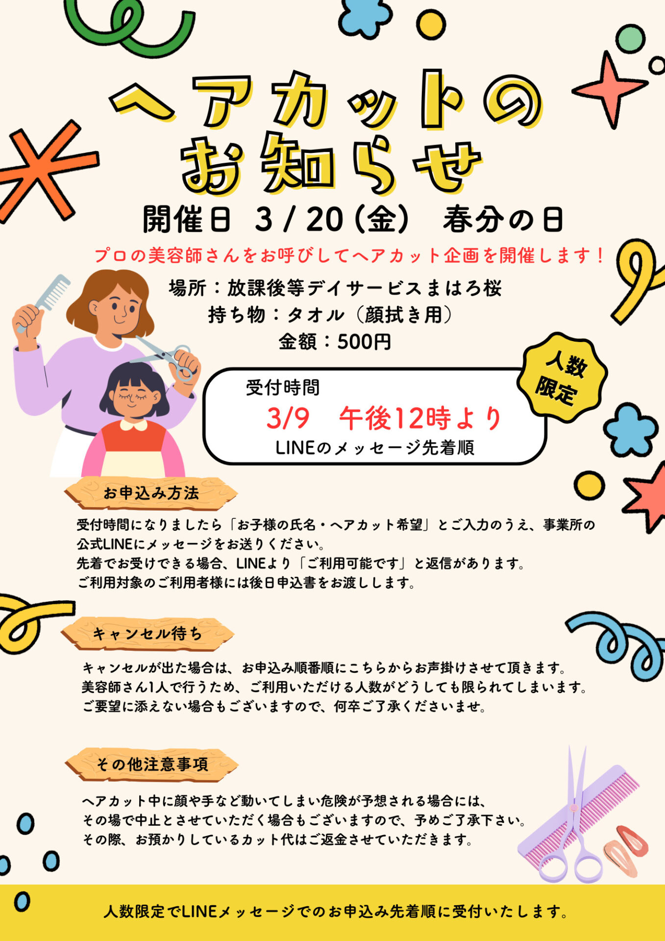 ・ヘアカットの参加は当日ご利用の方のみとなります。