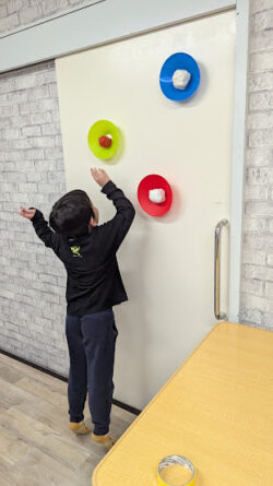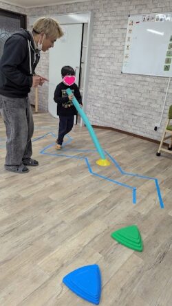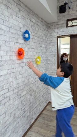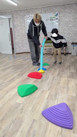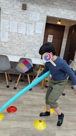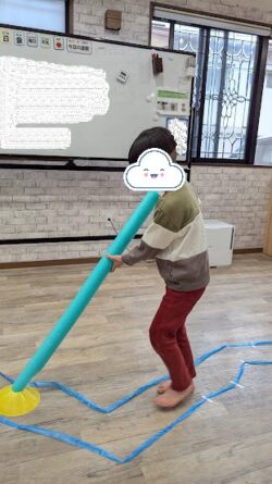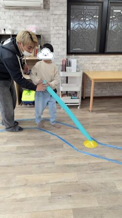 本日の課題はビジョントレーニングということで、スポンジ棒とコーンを使った課題へ挑戦してもらいました