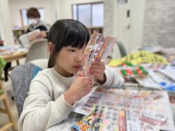 おどもたちには、チラシとお菓子のパッケージで制作してもらいます✂