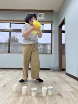 落ちてくるスカーフが床に落ちていく前に、カップにボールを入れます!