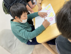 「〇から始まる言葉ゲーム」では、決められた文字から始まる言葉を考えて、紙に書き、発表します。📝
