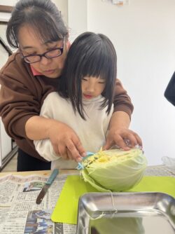 手を切らないように猫の手にしてスタッフと一緒に上手に切ることが出来ていました🔪