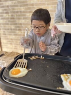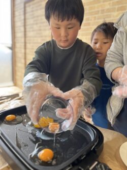 目玉焼きは、低学年の子供たち担当でした。卵を上手に割ってホットプレートで人数分の目玉焼きを作りました🍳