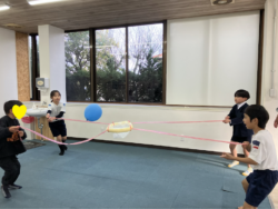 風船を飛ばして、ビニール袋に風船を4人で協力して入れるゲームです。