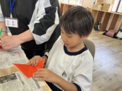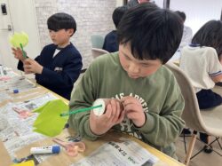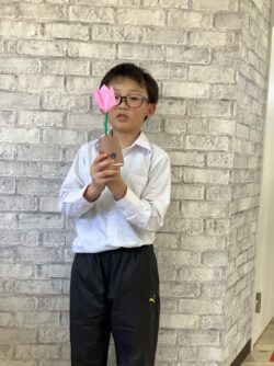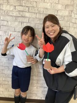 季節にあった花(🌷,🌸…)を折り紙で折って、ストローにセロハンテープで貼り