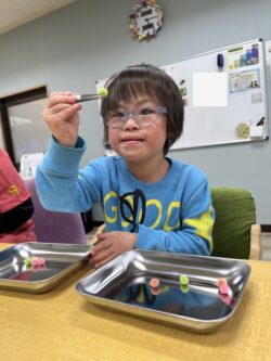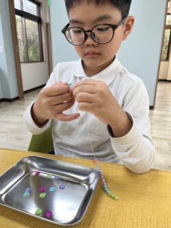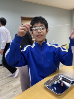 みんな色の組み合わせを考えて、紐とビーズの穴をしっかり見ながら