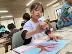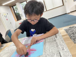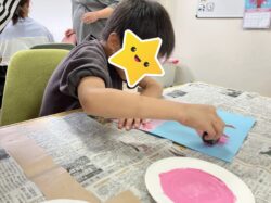 小さなスポンジにピンクの絵の具🩷をつけて