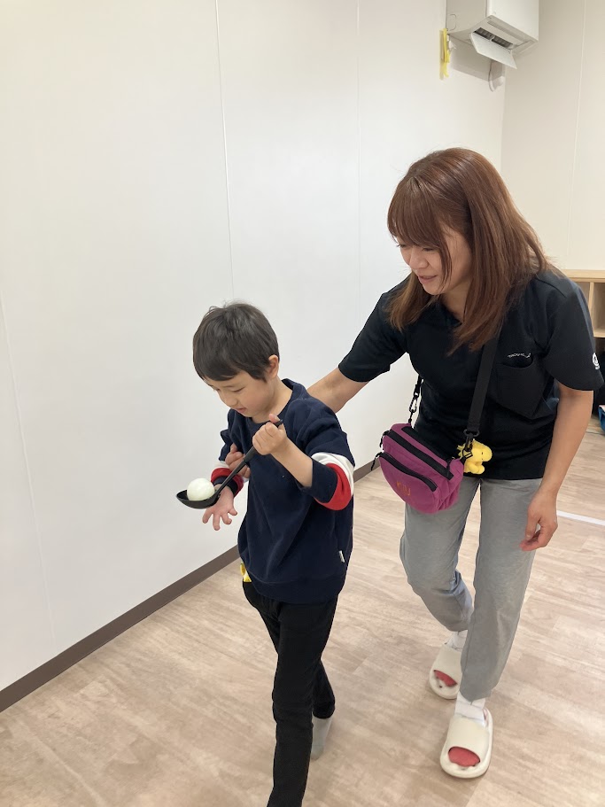 スプーンリレーとバランスボール転がしを2チーム分かれて対決しました!!