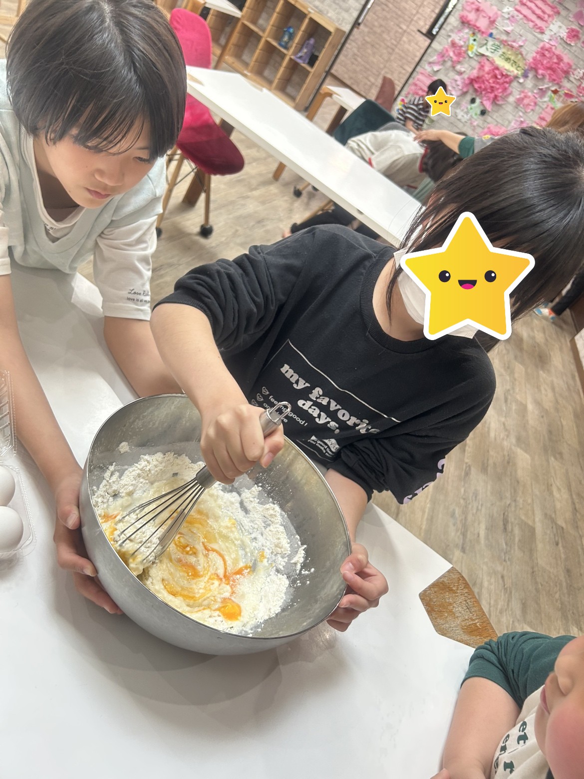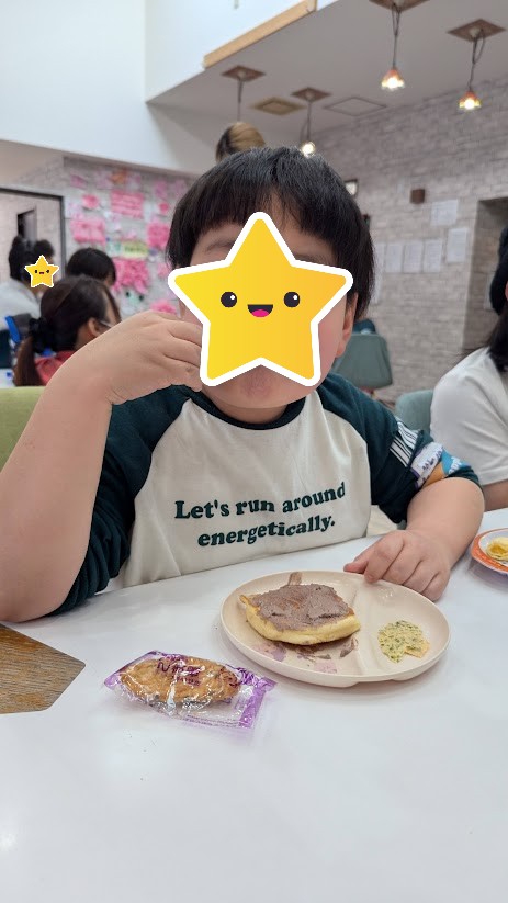 待っている間にホットケーキと豆腐チップスを作りました。混ぜるなどの手伝いをしてくれました。