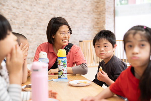 イベント活動でお腹がすいたら、みんなでおやつの時間。 おやつのあとは少しゆっくり休憩します。